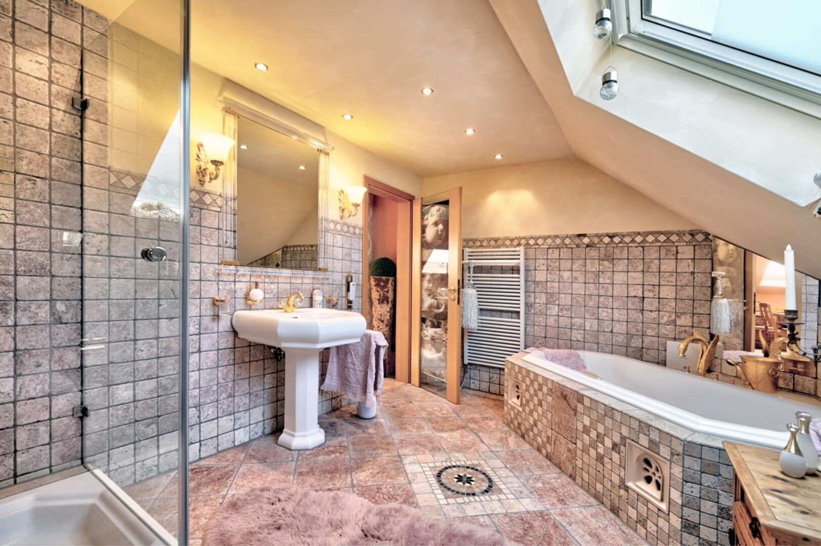 Im Erdgeschoss erwartet Sie eine großzügige Wohnung mit ca. 85 m² Wohnfläche. Zwei helle Wohn-/Schlafräume, eine einladende Wohnküche und ein kleines Arbeitszimmer bieten viel Platz für Ihre individuellen Bedürfnisse. Zwei lichtdurchflutete Bäder – eines mit großer Eckbadewanne und Dusche, das andere als elegantes Gäste-Duschbad sorgen für Komfort und Flexibilität. Eine praktische Abstellkammer ergänzt das Raumangebot. Besonders hervorzuheben sind die zahlreichen Fenster, die die Wohnung mit natürlichem Licht durchfluten.