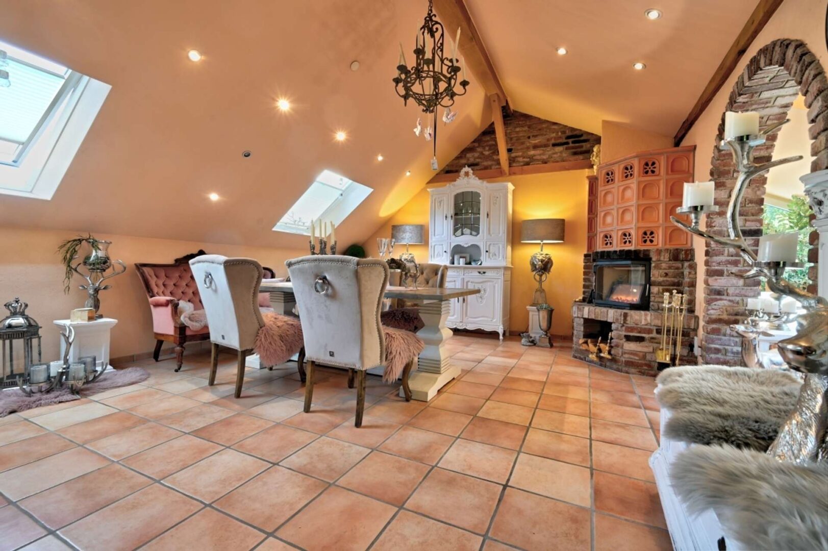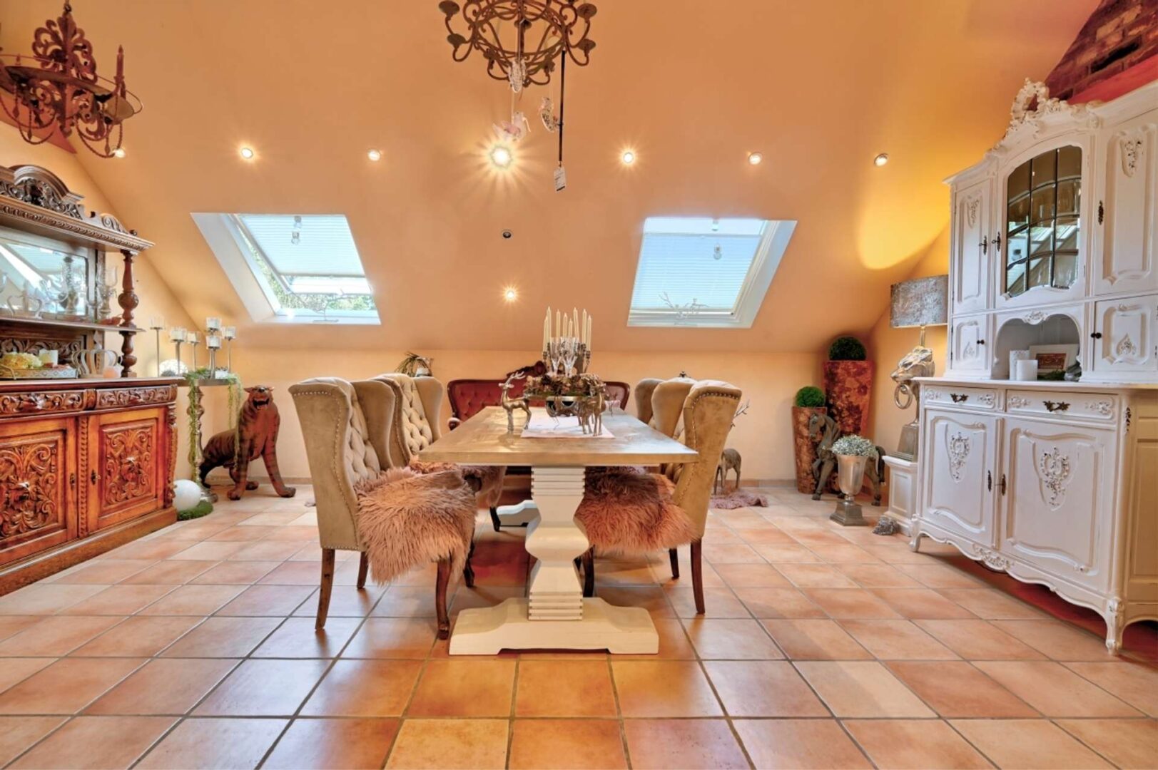Die obere Wohneinheit, mit ca. 77 m² Wohnfläche (nach Abzug der Dachschrägen), verzaubert durch ihren mediterranen Stil und die warme, einladende Atmosphäre. Ein stilvoller Kamin im Wohnzimmer verspricht behagliche Abende in den kühleren Monaten und verleiht dem Raum eine besondere Gemütlichkeit.