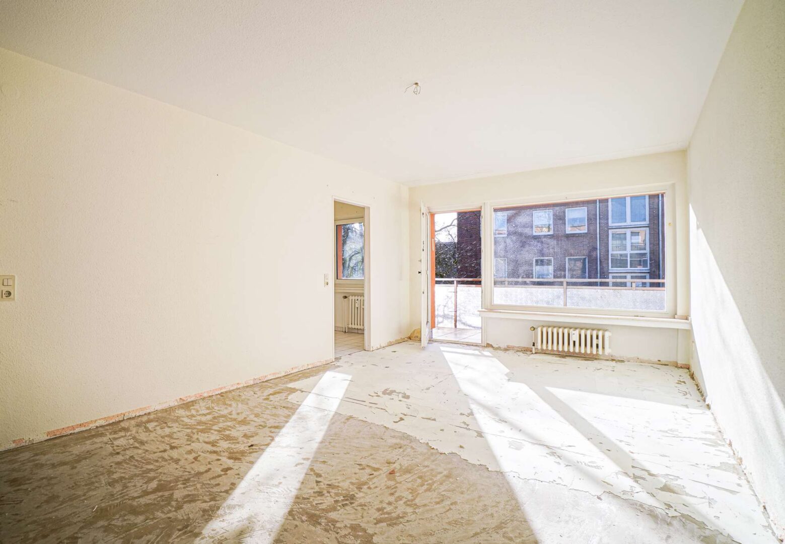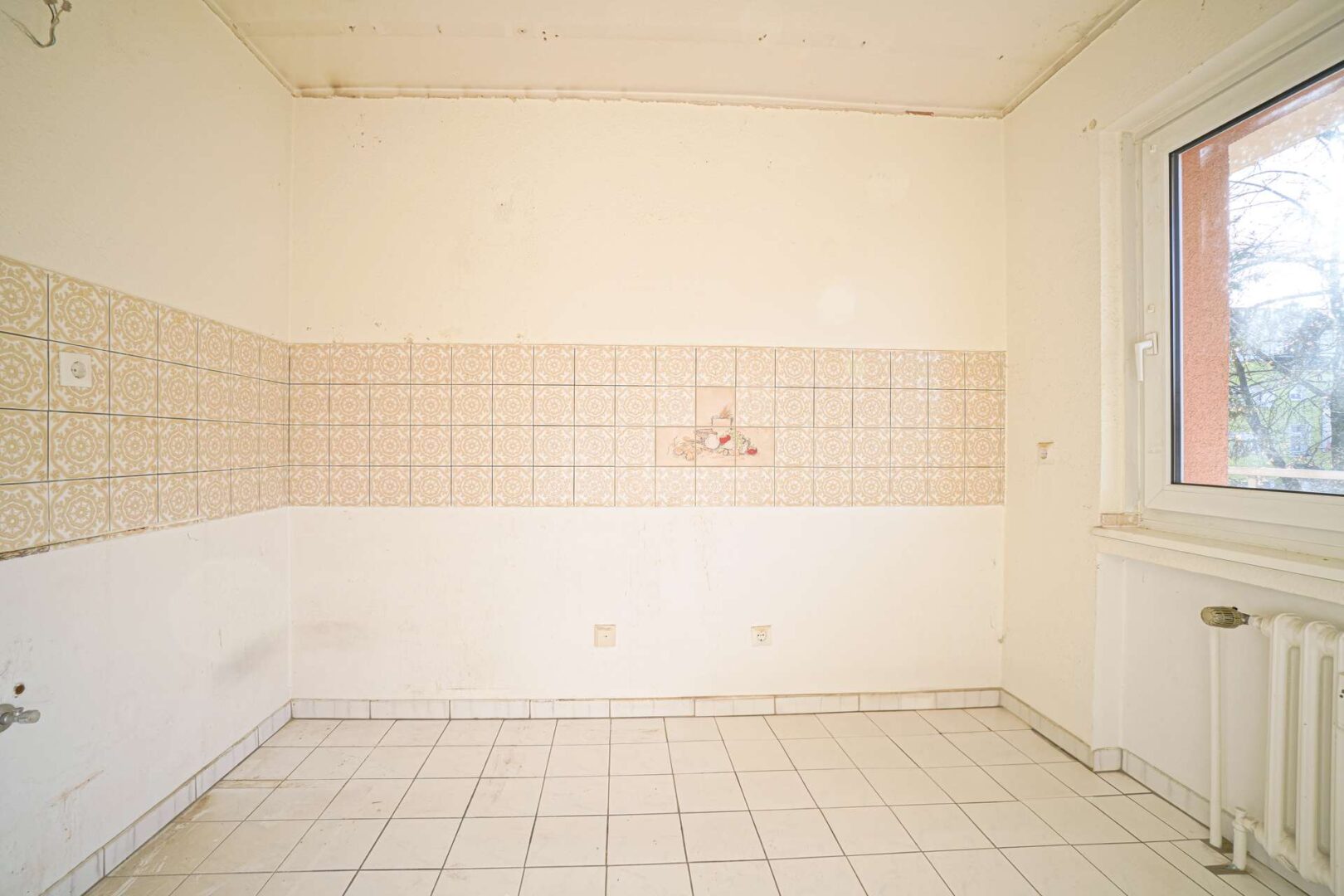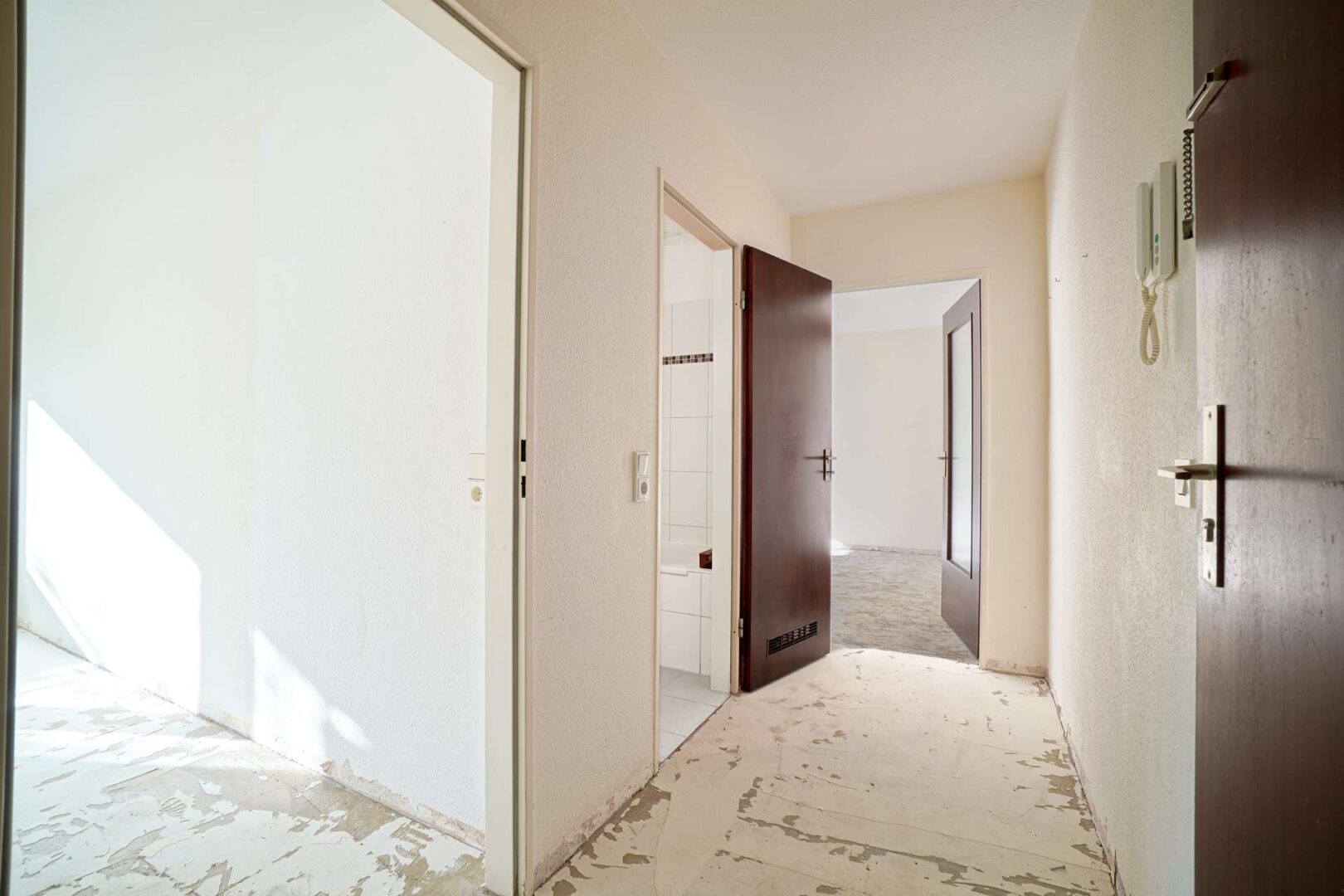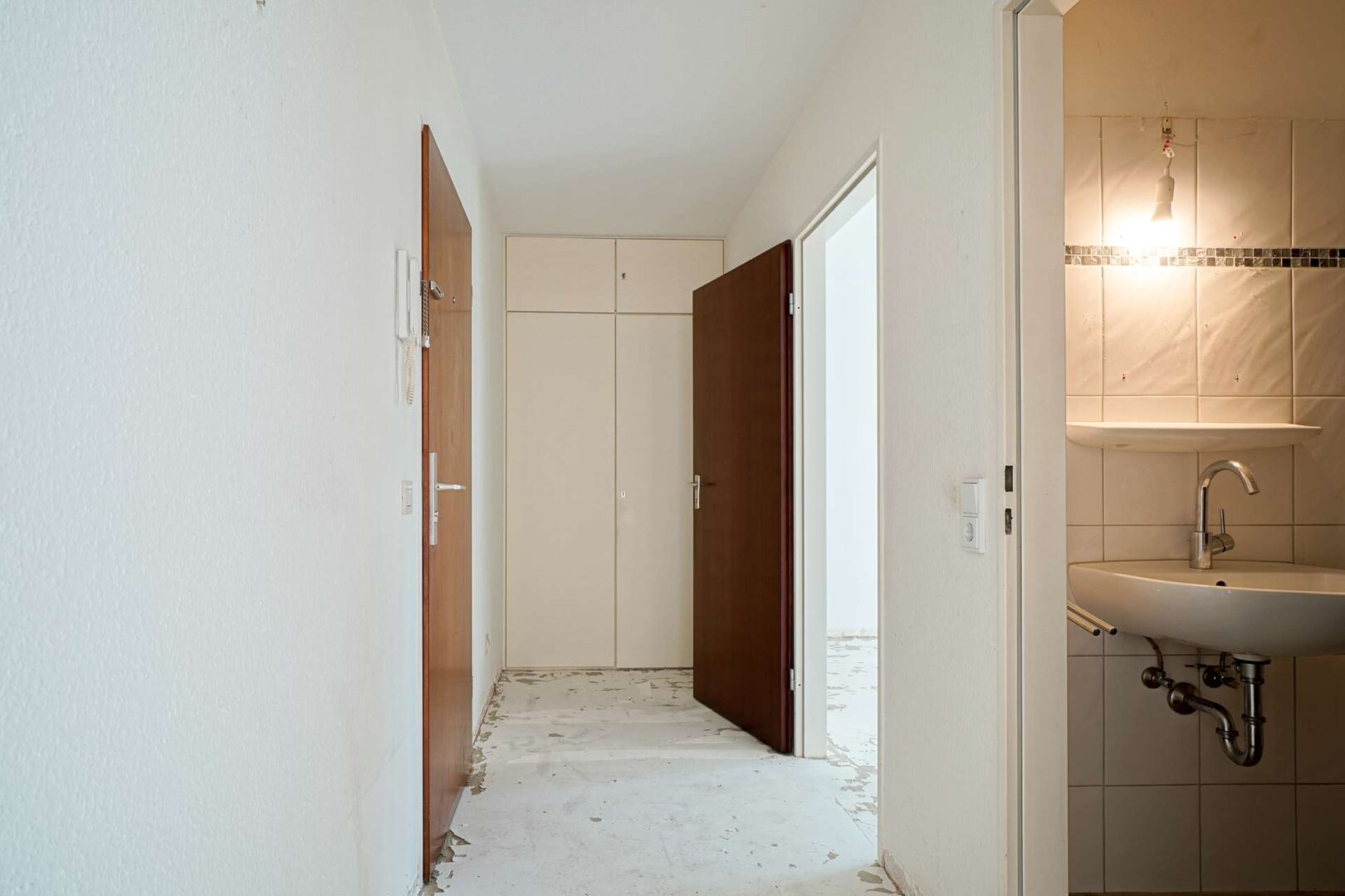 Der zentrale Flur führt Sie in alle Wohnräume. Das geräumige Wohnzimmer begeistert mit viel natürlichem Licht und direktem Zugang zum Balkon – der perfekte Ort zum Entspannen. Die angrenzende Küche ist offen zum Wohnzimmer und trägt so zu einer offenen, modernen Atmosphäre bei. Das Schlafzimmer mit fast 17 m² bietet großzügigen Platz für Ihre persönlichen Einrichtungsideen. Das Badezimmer, in zeitlosem Weiß gehalten, ist mit einer Badewanne ausgestattet. Abgerundet wird der Grundriss durch eine praktische Abstellkammer im Eingangsbereich.